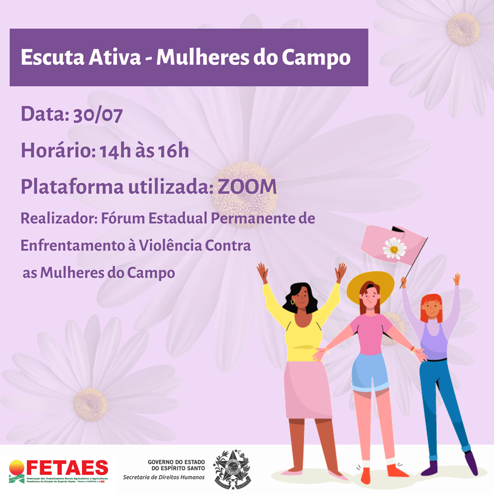 A Secretaria de Direitos Humanos (SEDH), por meio do Fórum Estadual Permanente de Enfrentamento à Violência contra as Mulheres do Campo e da Subsecretaria de Políticas para as Mulheres, promove o evento “Escuta Ativa – Mulheres do Campo”, que acontece de forma virtual, nesta quinta-feira (30), das 14h às 16h.