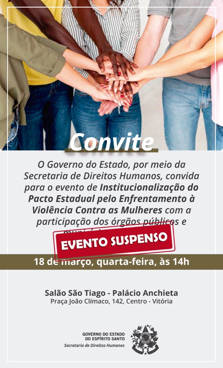A Secretaria de Direitos Humanos (SEDH) informa que suspendeu o evento de Institucionalização do Pacto Estadual pelo Enfrentamento à Violência contra as Mulheres, que ocorreria nesta quarta-feira (18), no Palácio Anchieta, em Vitória. O adiamento se dá em razão do estado emergência de saúde pública decorrente do novo coronavírus (COVID-19). Uma nova data será marcada e, posteriormente, divulgada.