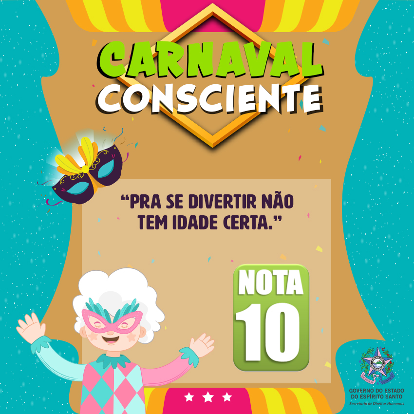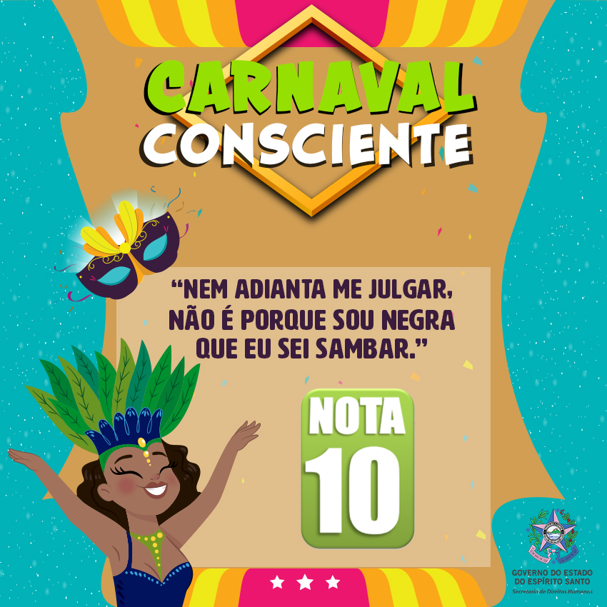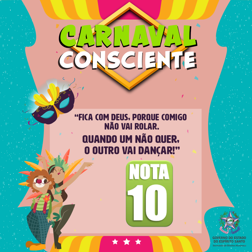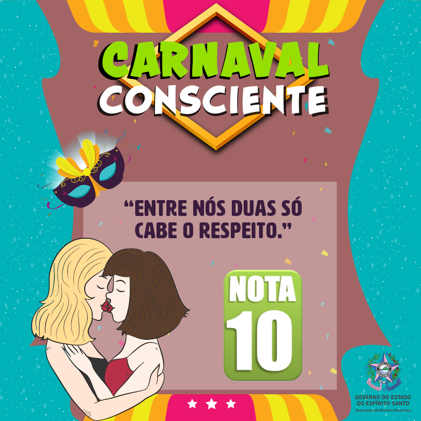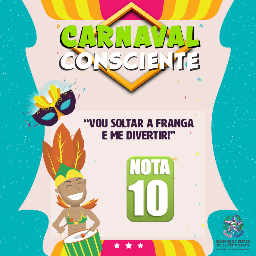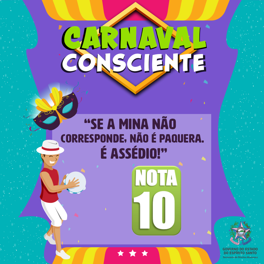A Secretaria de Estado de Direitos Humanos lançou no dia 1º de fevereiro a campanha #CarnavalConsciente, na página de Facebook @DireitosHumanosES para promover o respeito aos direitos de todos durante a folia – e depois que ela acabar também. Serão nove mensagens com o objetivo de conscientizar o folião sobre suas atitudes nota 0 e nota 10.