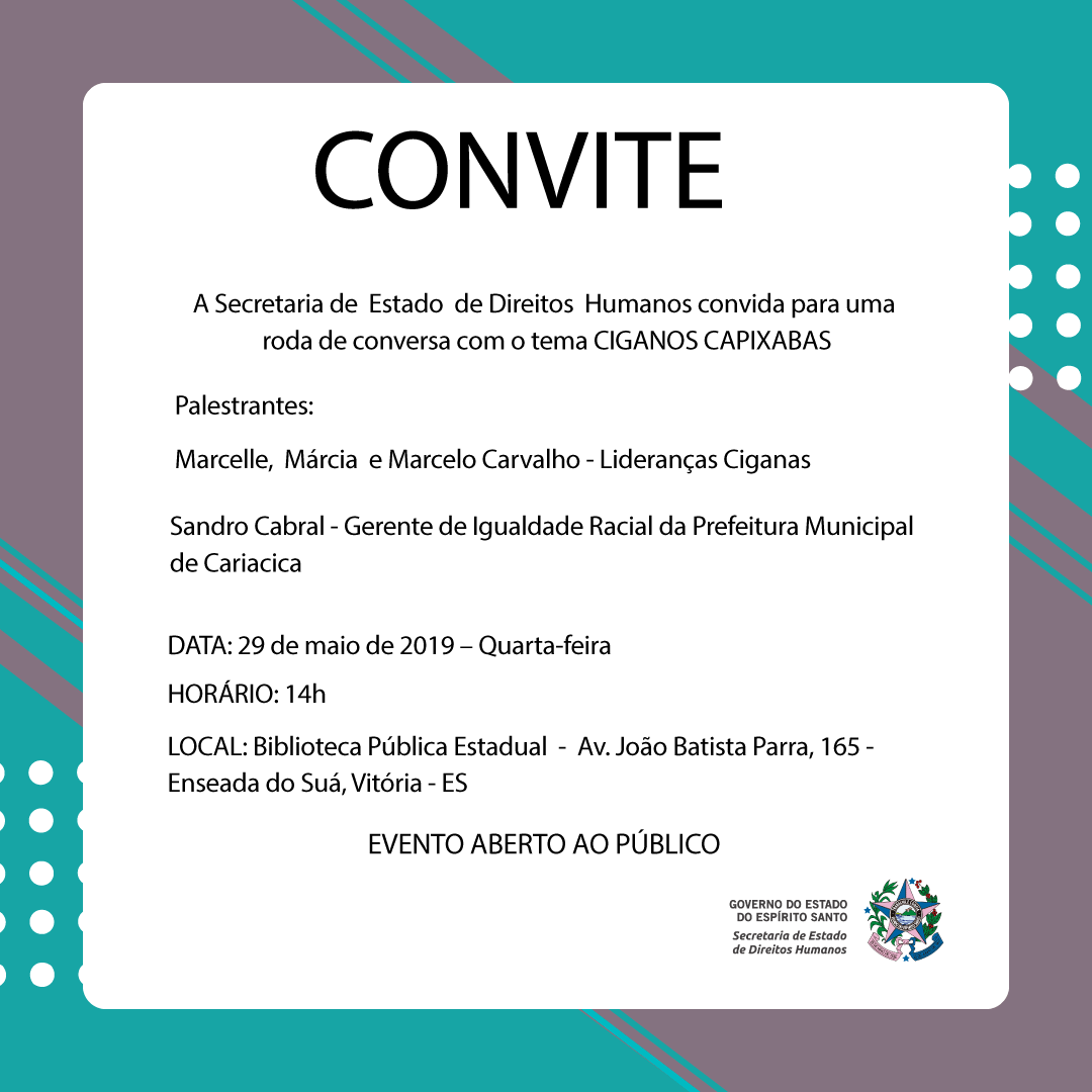 A Secretaria de Estado de Direitos Humanos (Sedh), por meio da Gerência Estadual de Igualdade Racial, realiza uma roda de conversa sobre os ciganos capixabas. O evento será nesta quarta-feira (29), na Biblioteca Pública Estadual, em Vitória, a partir das 14 horas e é aberto ao público, sem necessidade de inscrição.