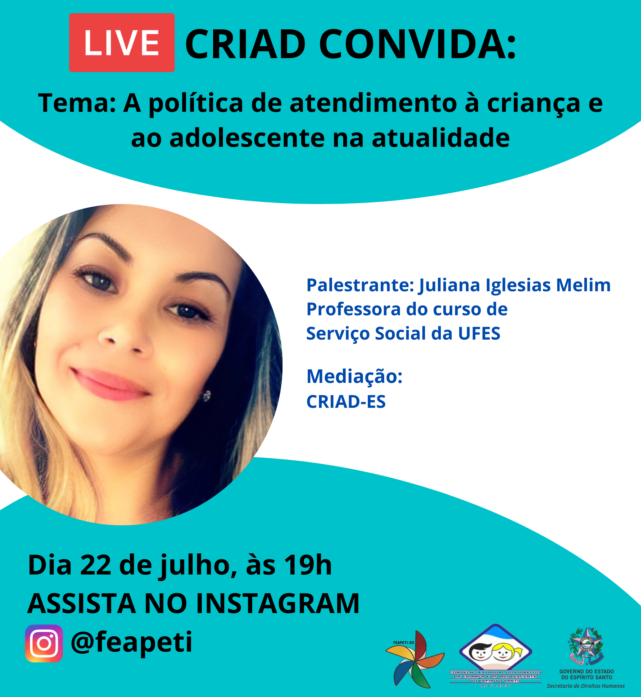 A convidada será a presidenta do Conselho Nacional dos Direitos da Criança e do Adolescente (Conanda), Iolete Ribeiro da Silva. A palestra on-line será ministrada pela presidenta do CRIAD e técnica do Programa de Erradicação do Trabalho Infantil (Peti), Alessandra Zardo. Já a segunda irá ocorrer no próximo dia 22 de julho, também às 19h, e abordará o tema “A política de atendimento à criança e ao adolescente na atualidade”. Desta vez, a convidada será a professora do curso de Serviço Social da Universidade Federal do Espírito Santo (Ufes), Juliana Iglesias Melim.