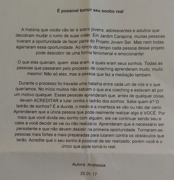 O Rony Santos, de 20 anos, por exemplo, entendeu com o “Jovem Ser” que o talento dele é a música e que ele precisa focar mais em seu sonho. Ele, que toca violão desde os 15 anos e já compôs mais de 20 músicas, começou a colher os bons frutos desse esforço: está participando de apresentações culturais e, nesta semana, foi a um programa de música da Rádio Espírito Santo.