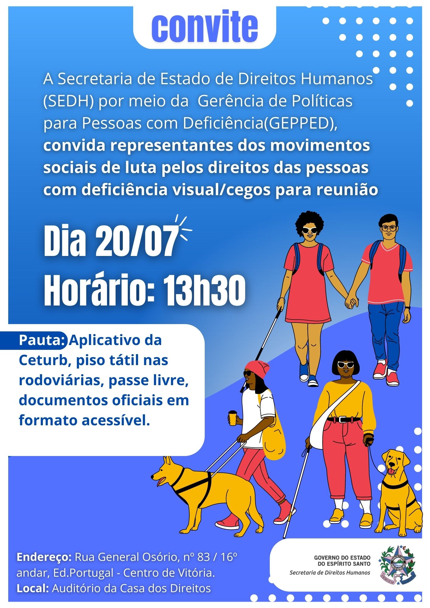 No próximo dia 20, a reunião será realizada com representantes dos movimentos pelos direitos das pessoas com deficiência visual/cegos. Os dois encontros acontecem na Casa dos Direitos do Espírito Santo “Advogado Ewerton Montenegro Guimarães, no Centro de Vitória.