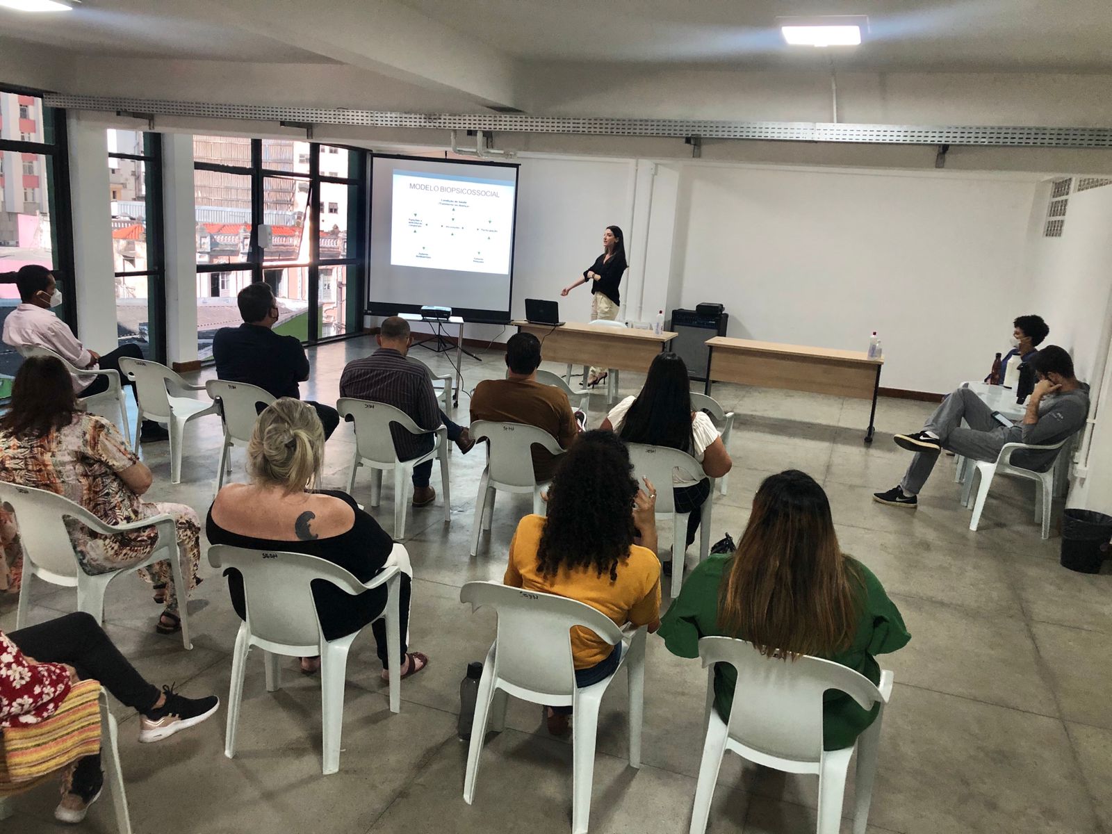 Dando prosseguimento à capacitação, a fisioterapeuta Louise Flores abordou a reabilitação de dependentes químicos com o papel da fisioterapia, enfatizando a importância e os benefícios da atividade física para essas pessoas.
