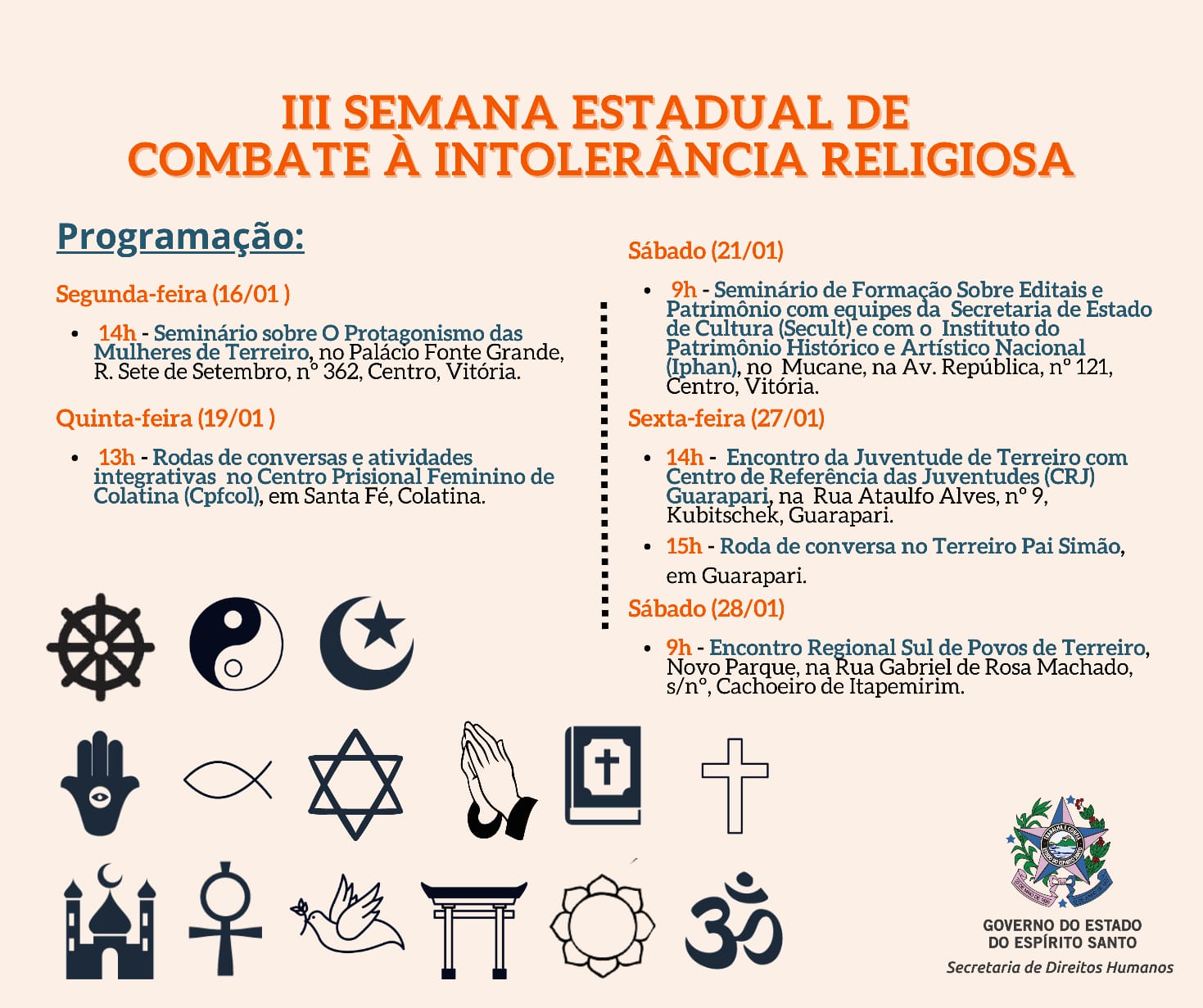 No dia 27 de janeiro, às 14 horas, será realizado o Encontro da Juventude de Terreiro, no Centro de Referência das Juventudes (CRJ) Guarapari, e, às 15 horas, ocorrerá uma roda de conversa no Terreiro do Pai Simão, também em Guarapari. No dia 28, acontecerá o Encontro Regional Sul de Povos de Terreiro, em Cachoeiro de Itapemirim.