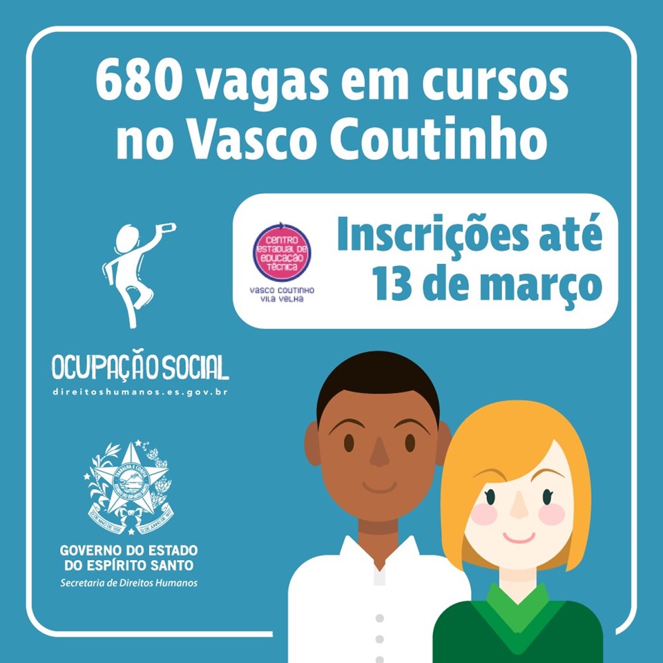 Estão abertas as inscrições do processo seletivo para os cursos de educação profissional técnica do CEET Vasco Coutinho. As 680 vagas são destinadas, preferencialmente, aos jovens de 16 a 24 anos, moradores de 14 bairros que fazem parte do Programa Ocupação Social. Serão atendidos os municípios de Vitória, Vila Velha, Serra e Cariacica.