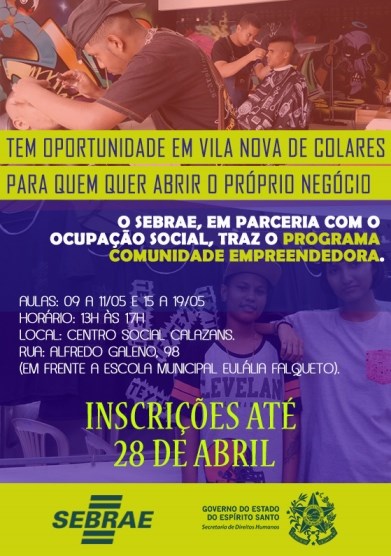 Estão abertas as inscrições para o Comunidade Empreendedora, com cursos ofertados pelo Sebrae-ES para o bairro de Vila Nova de Colares, na Serra. São 30 vagas disponíveis. As inscrições vão até dia 28 de abril. paa se inscrever clique aqui.