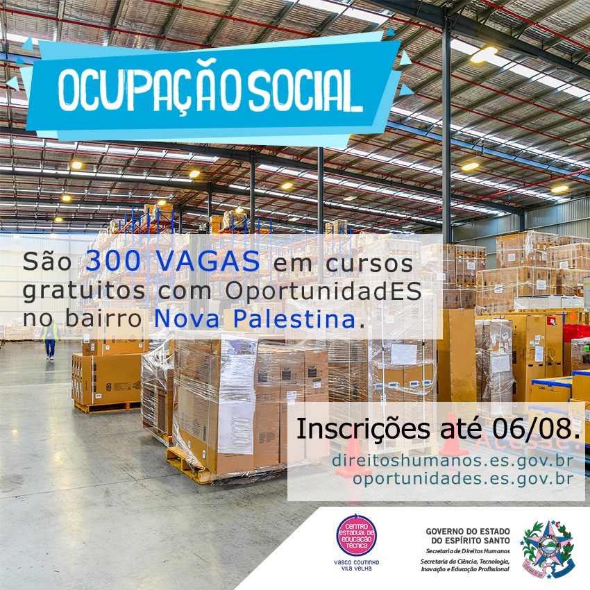 O OportunidadES é desenvolvido pela Secretaria de Estado de Ciência, Tecnologia, Inovação e Educação Profissional (Secti) e, por meio de uma parceria com a Secretaria de Estado de Direitos Humanos (SEDH), oferece vagas gratuitas para cursos profissionalizantes nos bairros atendidos pelo Programa Ocupação Social.