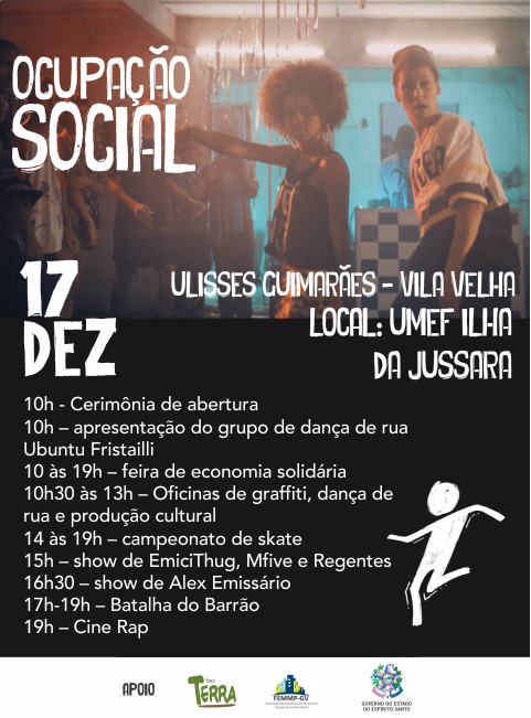 Os jovens de bairros atendidos pelo Programa Ocupação Social vão comandar as atividades artísticas e esportivas que acontecem neste sábado (17), em Ulisses Guimarães, Vila Velha, das 10 às 19 horas.